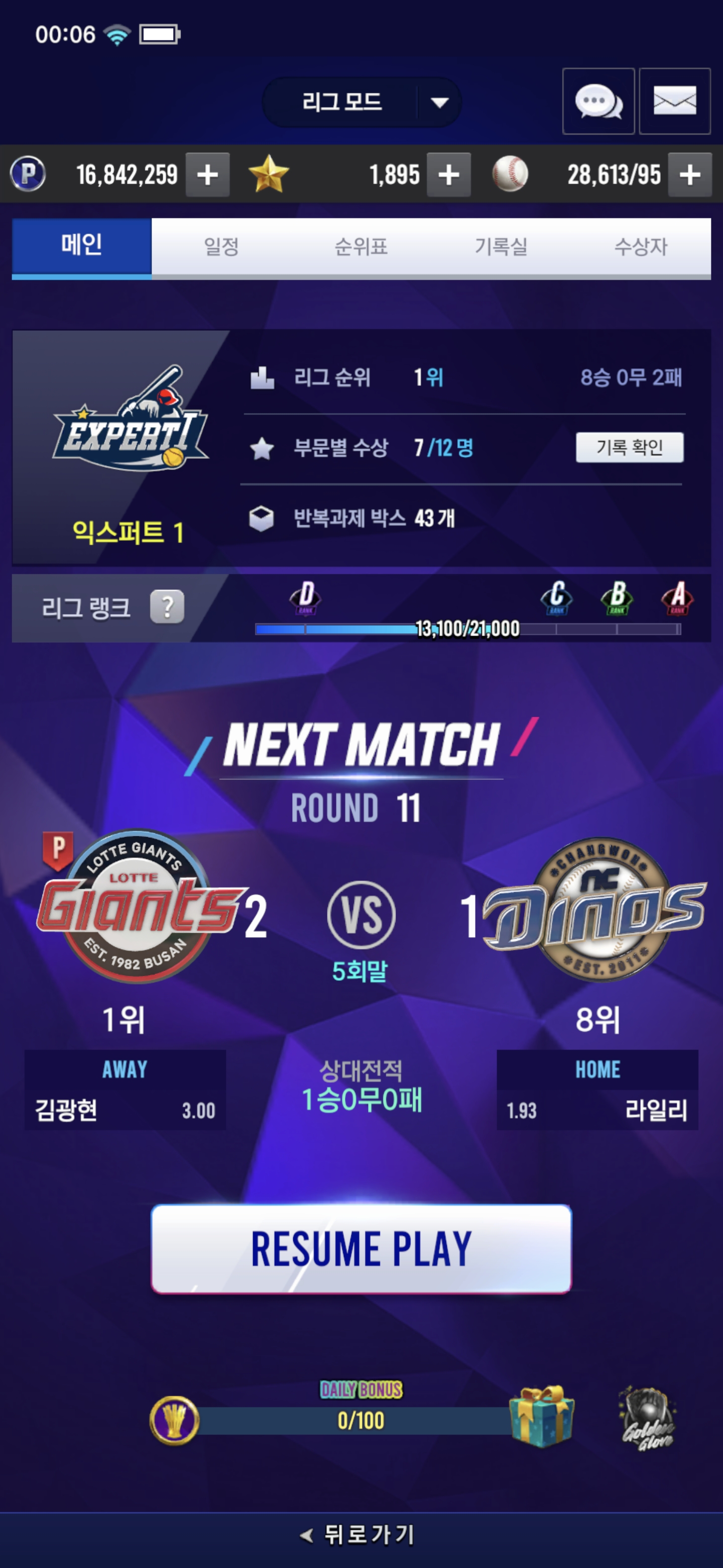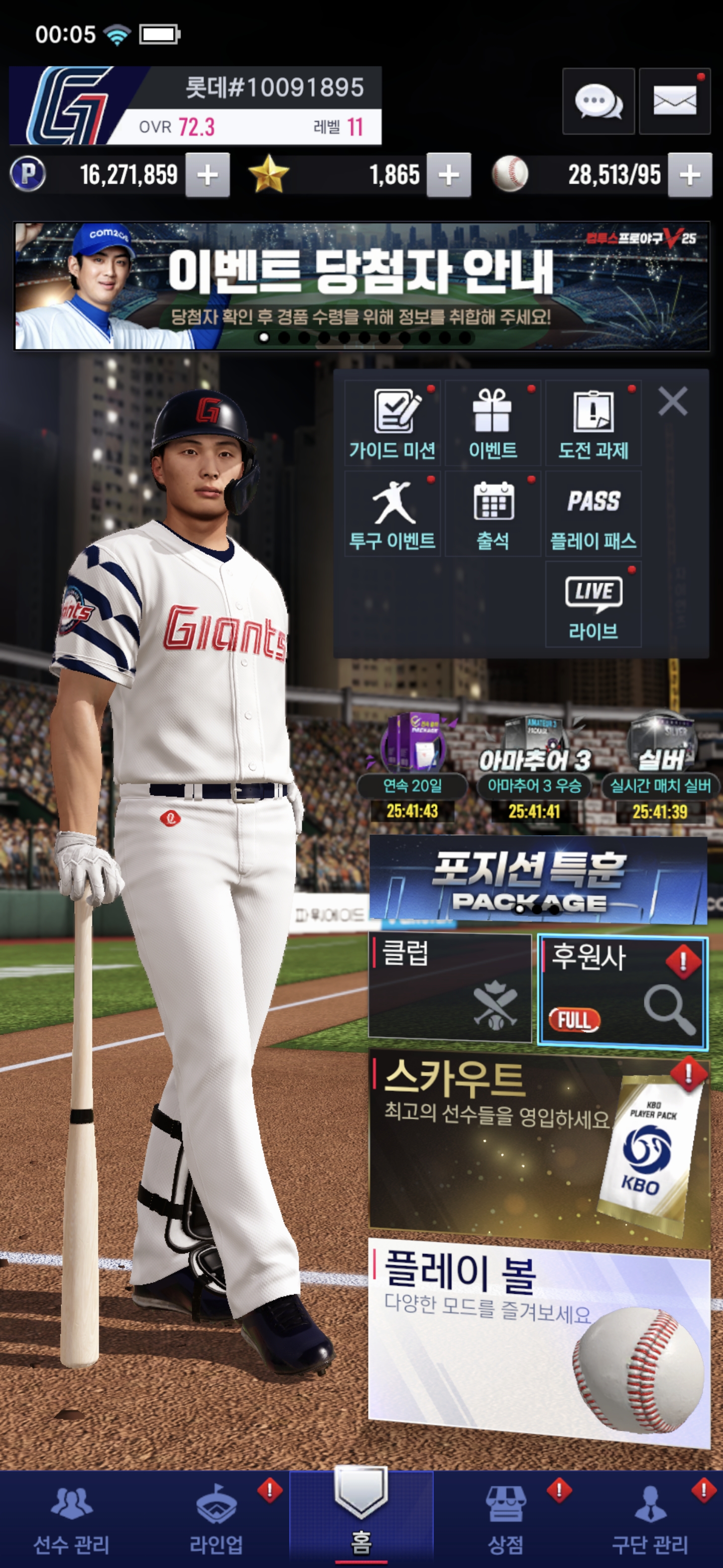 이게 제 메인 화면 입니다. 무과금이에요 심지어 좋은 선수를 뽑고 사람들과 경쟁에서 이기고 싶으면 현질하는게 맞지만 리그만 하는 경우라면 현질을 굳이 안하셔도 됩니다 .